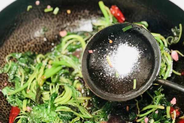 7、莧菜炒至斷生之後,加入少許的食鹽調味兒,然後再來點白糖提鮮,翻炒均勻就可以關火瞭,這裡給大傢普及個小知識,白糖的提鮮效果一點也不比雞精和味精差呢,而且對身體沒什麼壞處呢!