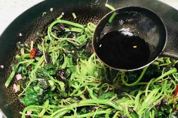 6、料頭爆出香味之後,下入莧菜翻炒幾下,然後加入1勺生抽、1勺蠔油、1勺蒸魚豉油,沿著鍋邊淋入,利用鍋邊的高溫激發出香味兒。