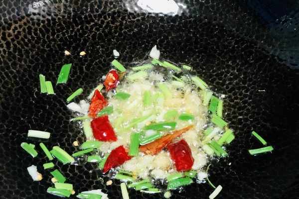 5、鍋中放入少許的豬油,用豬油炒出來的莧菜更加好吃,如果沒有豬油,可以用植物油代替,油溫5成熱的時候,下入幹辣椒、蔥段和一半的蒜末,爆出香味兒。
