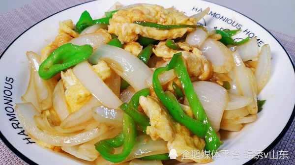 2、起鍋燒油,八成熱時倒入雞蛋液,大火煎一會兒,顏色金黃膨松後炒成大塊,盛出備用。鍋裡留底油,放入木耳翻炒一分鐘,再放入洋蔥、青紅辣椒翻炒一會兒。