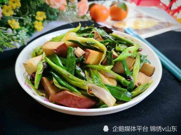 食材:蒜苗1把、雞蛋幹1包、幹辣椒3根、花椒少許、鹽、生抽、白糖。