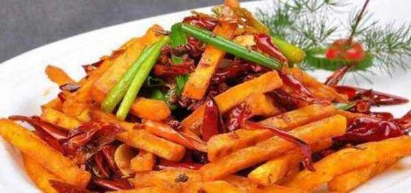 4、底油燒熱至50%,加入花椒、蒜、薑、米椒炒香,加入蒜炒1分鐘。將土豆條放入鍋中,拌勻,加入鹽、孜然、芝麻,炒至光滑裝盤。