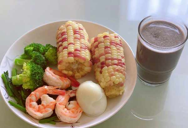 除瞭黑豆漿剩下的都是水煮的,不管是蔬菜和肉類不會放任何的調料,可以很好保存瞭食材中的膳食纖維素,玉米營養價值高,吃再多不會胖,用玉米減肥非常不錯,蝦仁和雞蛋蛋白質含量高,能增強人體的免疫力,同樣葷素搭配,再來一杯營養全面的黑豆漿,這道菜即使不減肥也可以照著做,食材都很簡單。