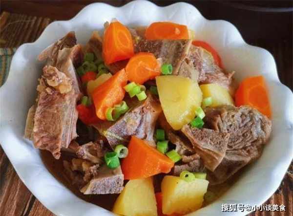 牛脊骨1000克、土豆1個、胡蘿卜1條、大蔥2個、五明、八角3粒、花椒若幹粒、月桂葉2片、精鹽適量、生抽2勺、料酒2勺、1一勺糖。