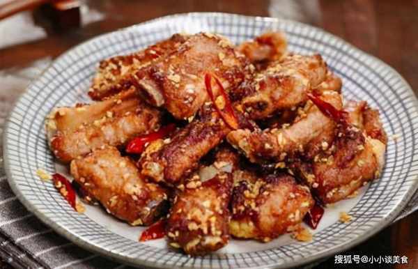 4、再燒一鍋油,放入蒜末和幹辣椒碎,炸至金黃,放入排骨,中火炸至蒜末裹在排骨上,熄火上桌。