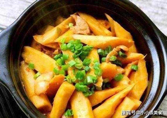 5、加入五花肉片和豆瓣醬拌勻,加入瀝幹的山藥條和其他調料炒約五分鐘至調味入味;