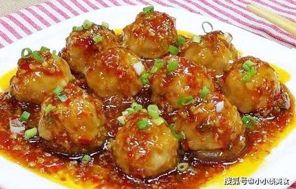 4、熱鍋倒入油,倒入薑末用小火翻炒幾下,加入蒜末爆香,加入泡椒末邊炸邊炸至油變黃變香,淋上甜的和酸醬拌勻,蓋上香菇的水燉熟,最後加入淀粉勾芡,淋在丸子上,撒上蔥花。