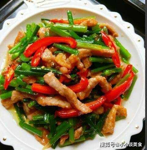 3、熱鍋燒熱油,放入醃好的肉絲炒至肉變色,加入韭菜苔,翻炒1分鐘出鍋。