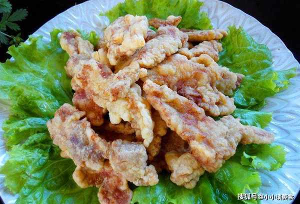 4.油溫升至7-80%,加入裡脊肉炸至外脆內軟,取出裝盤,淋上椒鹽或番茄醬即可服務