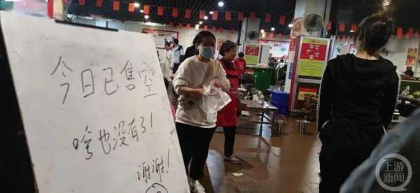 而在該知名網紅燒烤店旁邊的其他燒烤店,也是座無虛席。晚上9點,上遊新聞記著再次來到這裡時,燒烤店門前則立著一個塊白板:上面用黑字寫著“今日已售空,啥也沒有瞭,謝謝”。