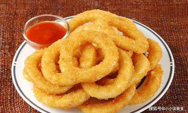 3、油鍋燒熱至180度,放入油中炸至金黃色。總的來說,洋蔥圈炸的很快,註意不要烤糊瞭