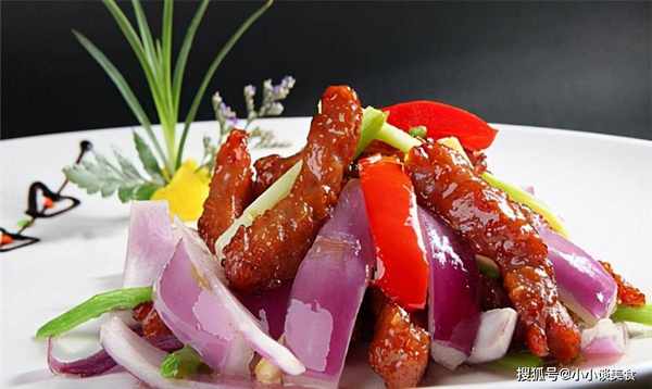 5、鍋內留約25克餘油,放入洋蔥翻炒20秒左右,加入牛肉片翻炒均勻,倒入20克料酒,翻炒均勻,快速翻炒50克花生米油,攪拌均勻即可食用。