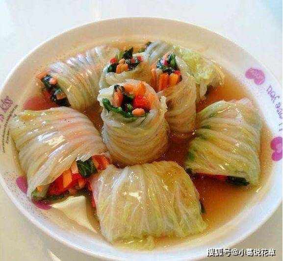3.將切好的蔬菜卷在卷心菜葉上切塊