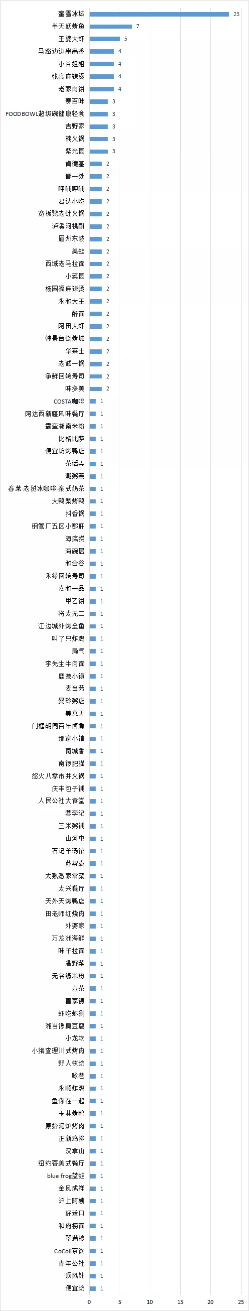 通報稱,2023年,市、區市場監管局繼續在全市范圍內對連鎖餐廳、“網紅”餐廳、美食城等餐飲企業開展食品安全大檢查。根據2023年1月以來發佈的通報統計,共有超過百個品牌的近180傢連鎖餐飲門店存在食品安全問題,其中蜜雪冰城存在問題的門店數量最多,涉及23傢。半天妖烤魚共有7傢門店出現食品安全問題,在連鎖餐館中數量最多。