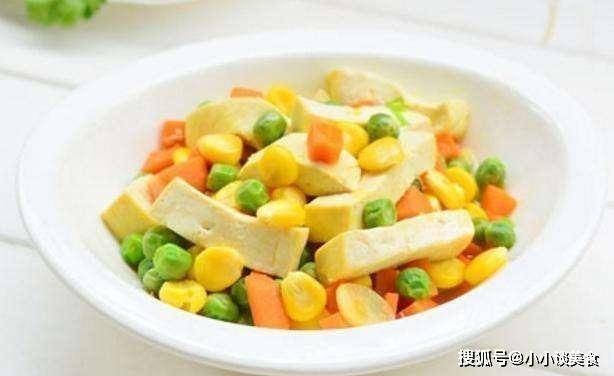 2.豆腐塊和玉米粒用開水焯一下,撈出備用;