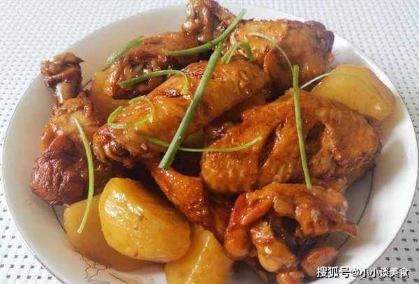 雞翅洗凈切成兩刀,入味清淡。用滾刀將土豆切丁,小蔥切片,生薑切片。