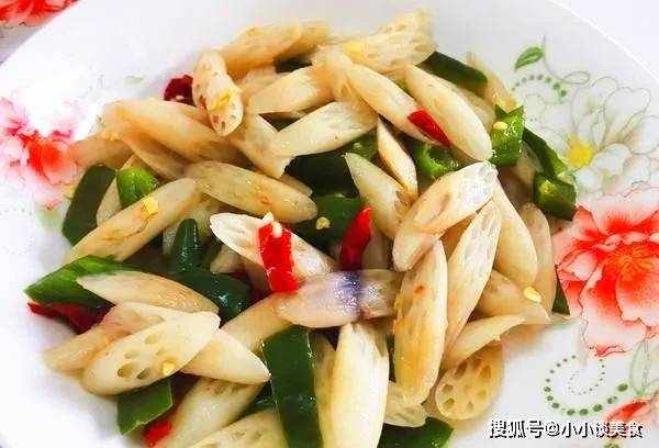 2、鍋內倒入油,燒熱,加入普丁、蒜末和青紅椒爆香,倒入藕片,翻炒兩分鐘,倒入白醋,加少許白糖,適量少許鹽,翻過來。攪拌均勻,從鍋中取出,撒上切碎的蔥。