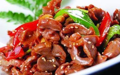 4、炒至雞胗熟透,加入青紅椒、鹽、雞高湯拌勻,撒上芝麻即成。