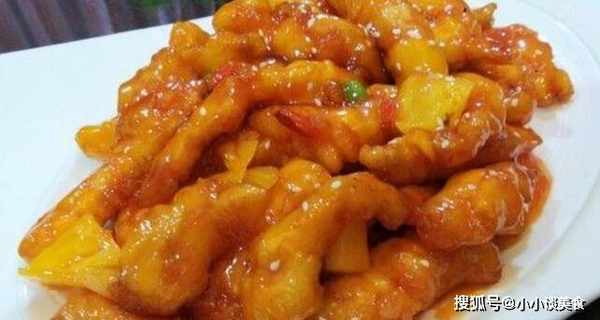 5、炸好後,倒掉多餘的植物油,隻留一湯匙左右。將切碎的青椒、紅椒和洋蔥放入鍋中,炒香。倒入醬汁和菠蘿,攪拌均勻。然後加入炸好的娃娃片,翻炒後裝盤。