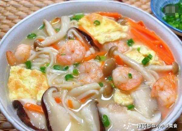 主料:金針菇、香菇、蟹味菇適量、胡蘿卜半根、雞蛋1個、蝦仁10隻、蔥少許、鹽少許