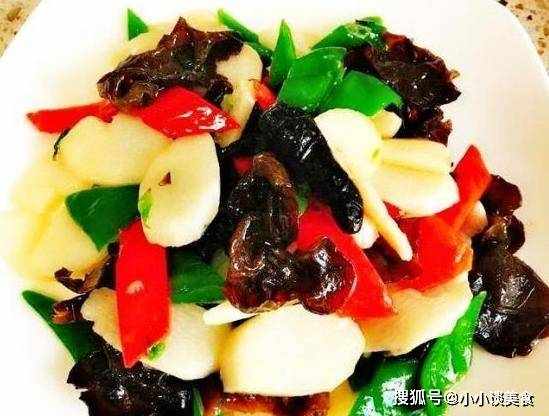 3、加入香菇和山藥翻炒幾下。加入綠色和紅色辣椒片,炒至酥脆。