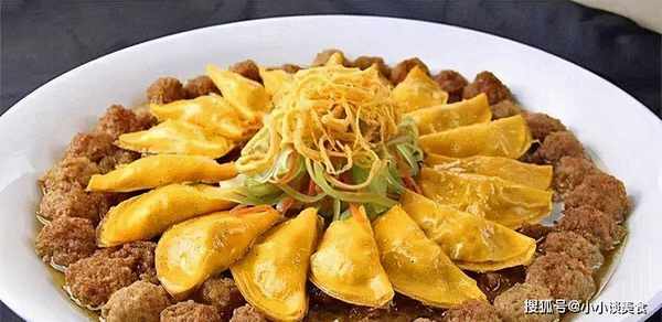 3、將丸子放在容器底部,放上蛋皮餃子,倒入適量鮮湯,放入蒸鍋蒸熟,取出,裝飾上蛋皮、水煮青筍和蘿卜果泥,沒關系。