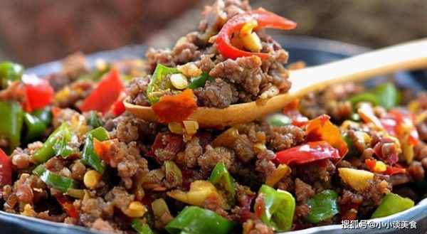 5.倒入牛肉碎翻炒,加入1湯匙料酒和生抽
