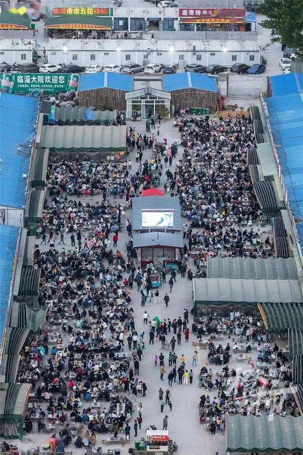 傍晚時分,山東淄博臨淄大院裡已經坐滿瞭吃燒烤的顧客,從附近一幢高樓上望下去密密麻麻。