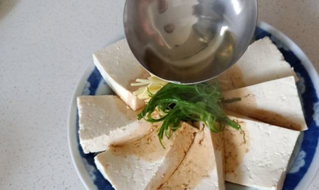 6、最後淋上熱油,把蔥薑給炸香,豆腐蘸著醬汁這樣吃太過癮瞭,夏天非常簡單的一道菜,豆腐的營養豐富,傢裡面有老人,小孩的一定要多做著吃。豆腐能做出來的美味簡直就是數不勝數,但是不管怎麼吃我都覺得最原始的味道才是最醇香的,喜歡吃豆腐的小夥伴可不要錯過瞭哈。