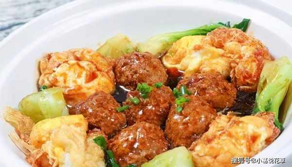 3.油熱至70%,放入獅子頭胚,炸至去皮,然後一顆一顆加入雞蛋,炒至膨化,撈出;上海清肺水備用。