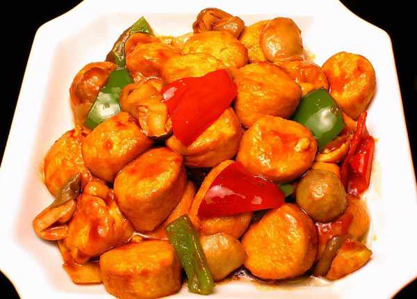 3、鍋內倒入適量油,放入香菇略炒,加入青紅椒炒勻,加入醬汁,煮至軟爛,下入日式。快炸豆腐軟醬!