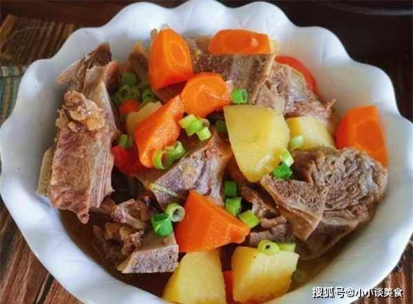 牛裡脊肉1000克、土豆1個、胡蘿卜1根、大蔥2個、八角3粒、花椒若幹粒、月桂葉2片、精鹽適量、醬油2勺、料酒2勺、白糖1勺醬油。