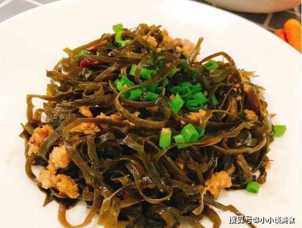 1.將切碎的海帶焯水備用。鍋內放油,爆香小蔥、薑、蒜末。