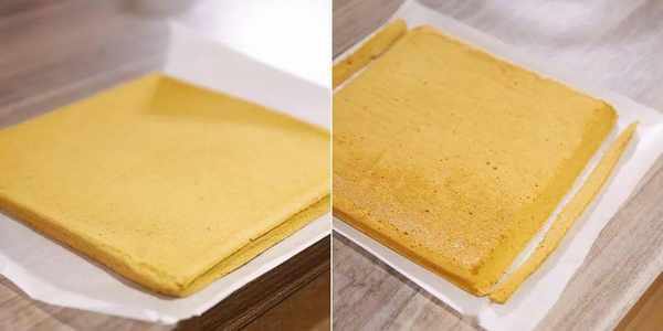 修一下蛋糕的邊。選好兩個邊,用鋸齒刀斜斜的切去一條(修邊是為瞭蛋糕卷的切面更好看,不修也沒關系)。