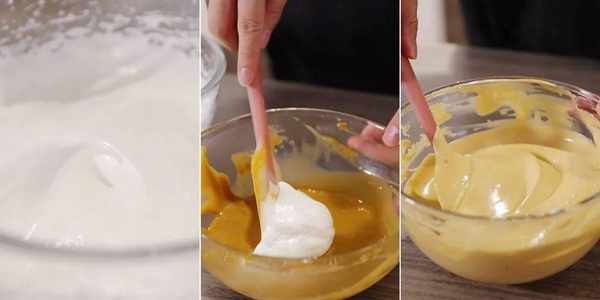 面糊應該非常稠厚、細膩。混合的過程要大幅度翻拌,盡快拌勻,不要長時間混合導致蛋清消泡。如果混合好的面糊質地變稀,或者變得粗糙,都是蛋清消泡的表現,這樣也烤不出細膩的蛋糕。