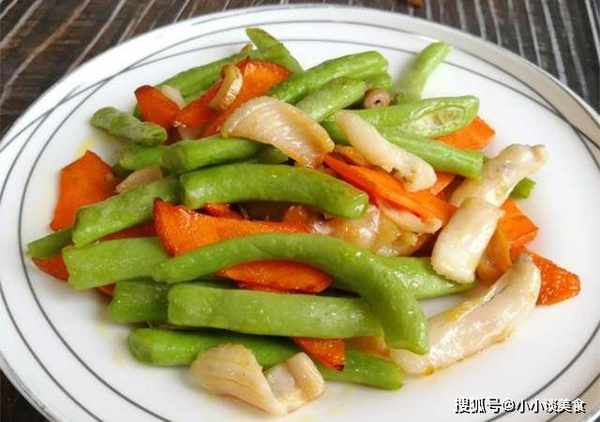 1.將綠豆的尾部和老莖撕下,對折成楔形,胡蘿卜切片。