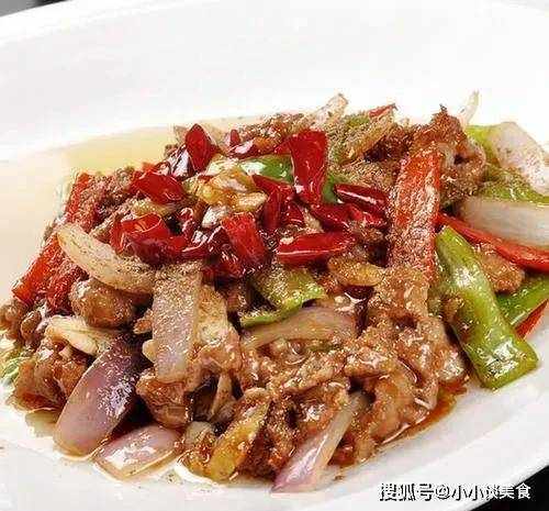 3、熱鍋冷油,放入洋蔥、花椒、紅辣椒翻炒片刻,然後放入牛肉片炒熟;