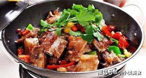 8、加入排骨炒香,再加入杏鮑菇炒一分鐘,再加入洋蔥、黃瓜、小青椒、豆角炒兩分鐘,加入雞湯、鹽、糖。