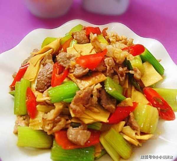 原料:芹菜、豆腐皮、肉片、醬油料酒