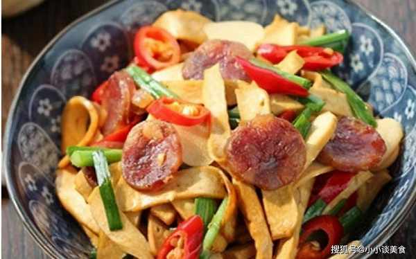 材料香腸1根,香幹4條,小韭菜1條,紅辣椒2個,極鮮1勺,蠔油1勺,油適量,鹽適量。