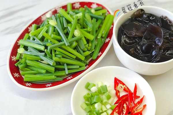 2、把幹木耳放入溫水中浸泡至軟化後切成細絲備用。將韭菜苔淘洗幹凈後切掉根部口感比較老的地方,然後再切成適合食用的寸段;小蔥去皮去根後切成蔥花,小米辣切成細絲。