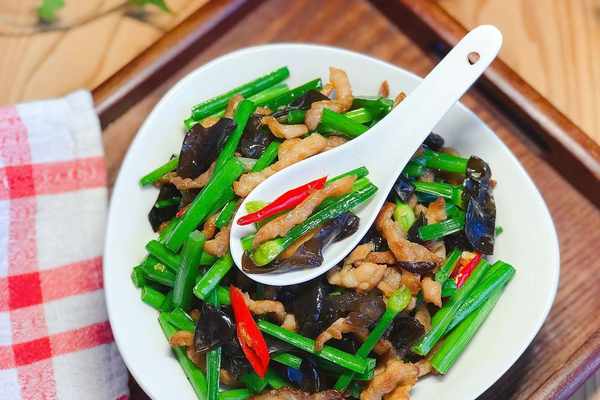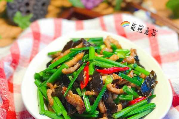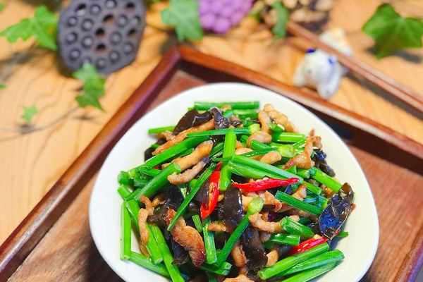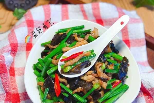 韭菜苔炒肉絲:主食材:韭菜苔280g、豬肉150g、木耳5g