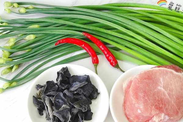 1、首先我們來準備一下做這款【韭菜苔炒肉絲】需要用到的食材:新鮮的韭菜苔1把,因為還要搭配肉絲和木耳一起炒,所以280克韭菜苔就能炒一大盤瞭。一小塊豬瘦肉,少許黑木耳,1棵蔥和2根小米辣幫忙熗鍋兒。