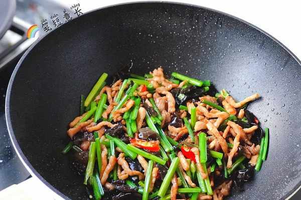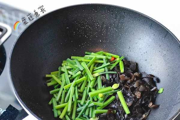 5、肉絲盛出後鍋中還留少許底油,繼續加熱後倒入切好的蔥花辣椒絲爆出香味兒,然後將切好的韭菜苔和木耳絲下鍋煸炒。