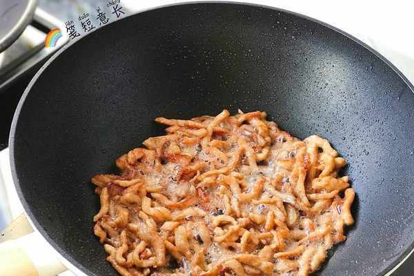 4、炒鍋燒熱後倒入適量花生油,油溫六成熱時倒入醃制好的肉絲,用筷子將凝固成一坨的肉絲扒拉松散,煸炒至肉絲表層凝固焦黃後盛出備用。