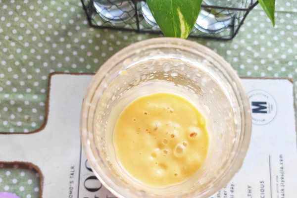 3、芒果去皮後,切成小塊,將大部分芒果塊放入料理機中,留出少許芒果塊備用,再加入一半酸奶,攪拌成芒果奶昔。
