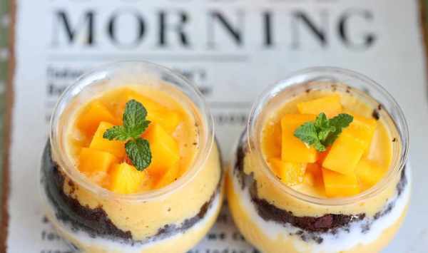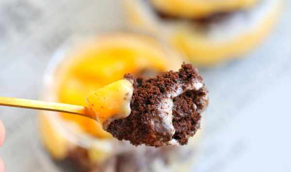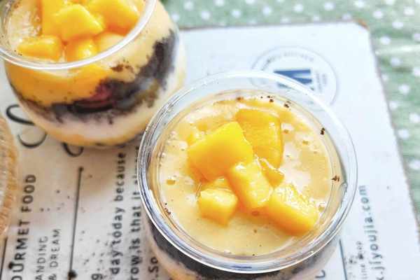 6、最後再放入幾塊芒果塊,好吃又簡單的奧利奧芒果杯就做好瞭。