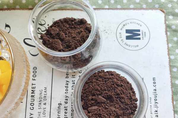 4、準備兩個小杯子,這些食材可以做兩個小杯,先各取一半的奧利奧碎鋪在杯子最底部。