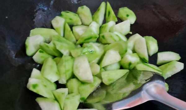 炒鍋內加少許食用油,燒熱到五成熱,將絲瓜倒進鍋中,快速翻炒,炒到體積有些縮小,內芯不再發白,加入少許食鹽翻炒,微微出水。