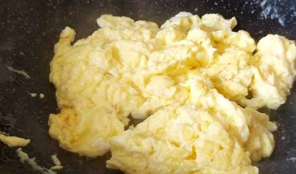 炒鍋預熱後加油,燒熱到七成熱,將雞蛋倒進鍋內,炒出大塊盛出,鍋面溫度要高,炒制速度要快,別炒老瞭,盛吃的目的是保持軟嫩,若一直放在鍋內,雞蛋會被炒老難吃。